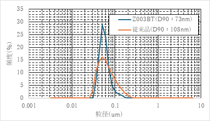 本開発品は、D50の低減や分布幅の縮小だけでなく、100nm超の粗大粒子の発生を抑える粒度分布設計を重視しています。
